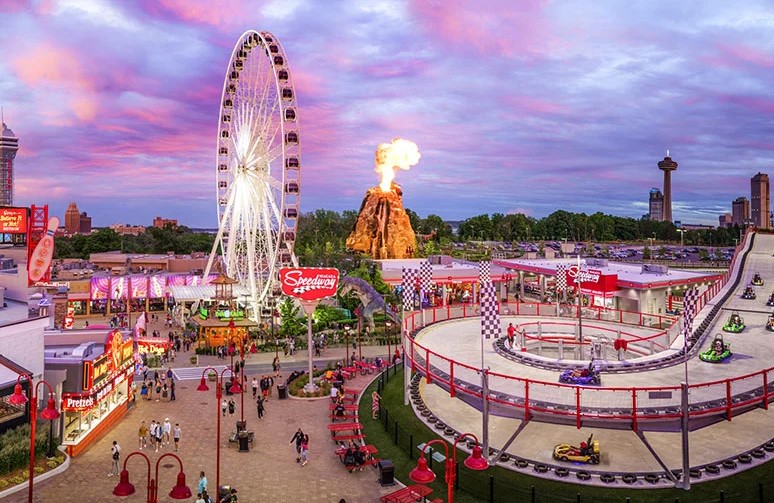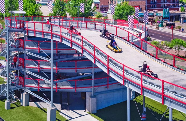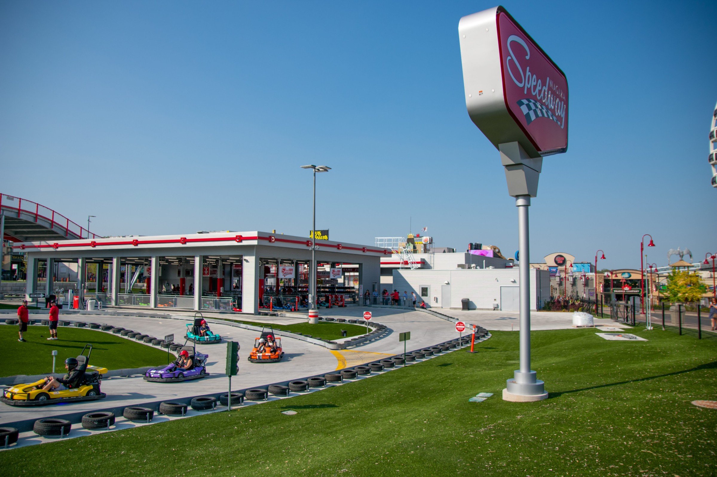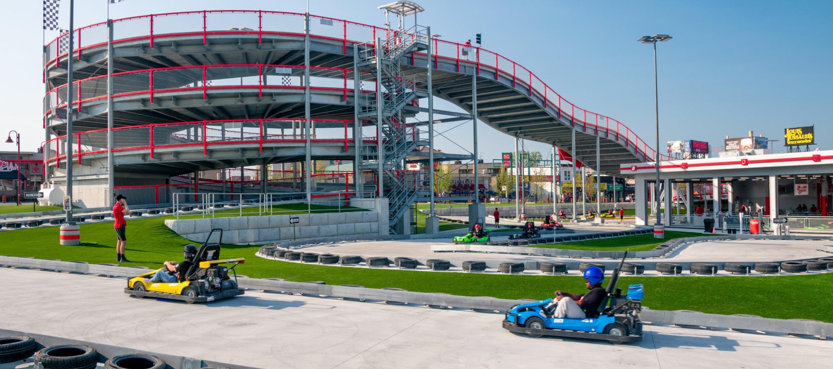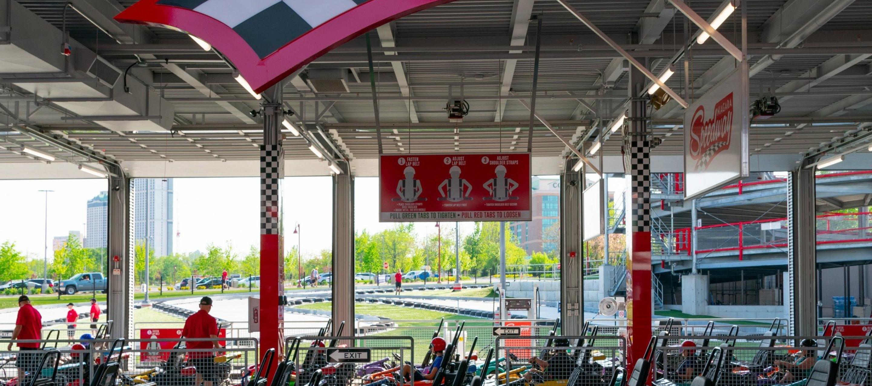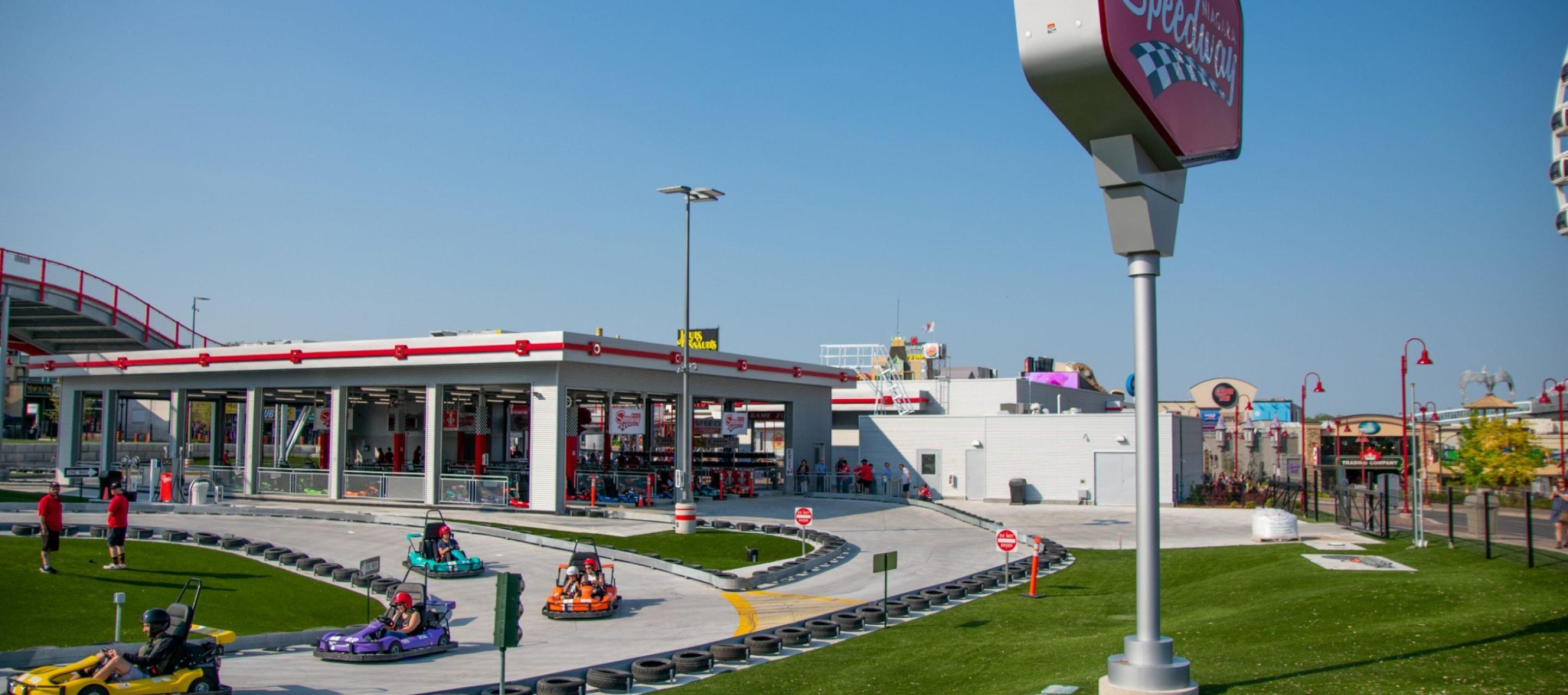 Located at the top of the "Street of Fun", the Niagara Speedway is North America's largest elevated go-kart track facility. Dubbed a "mario-kart" inspired racetrack, this Niagara Falls Raceway is a marriage of traditional throttle powered go-karts with the added thrill of an elevated roller coaster style track.